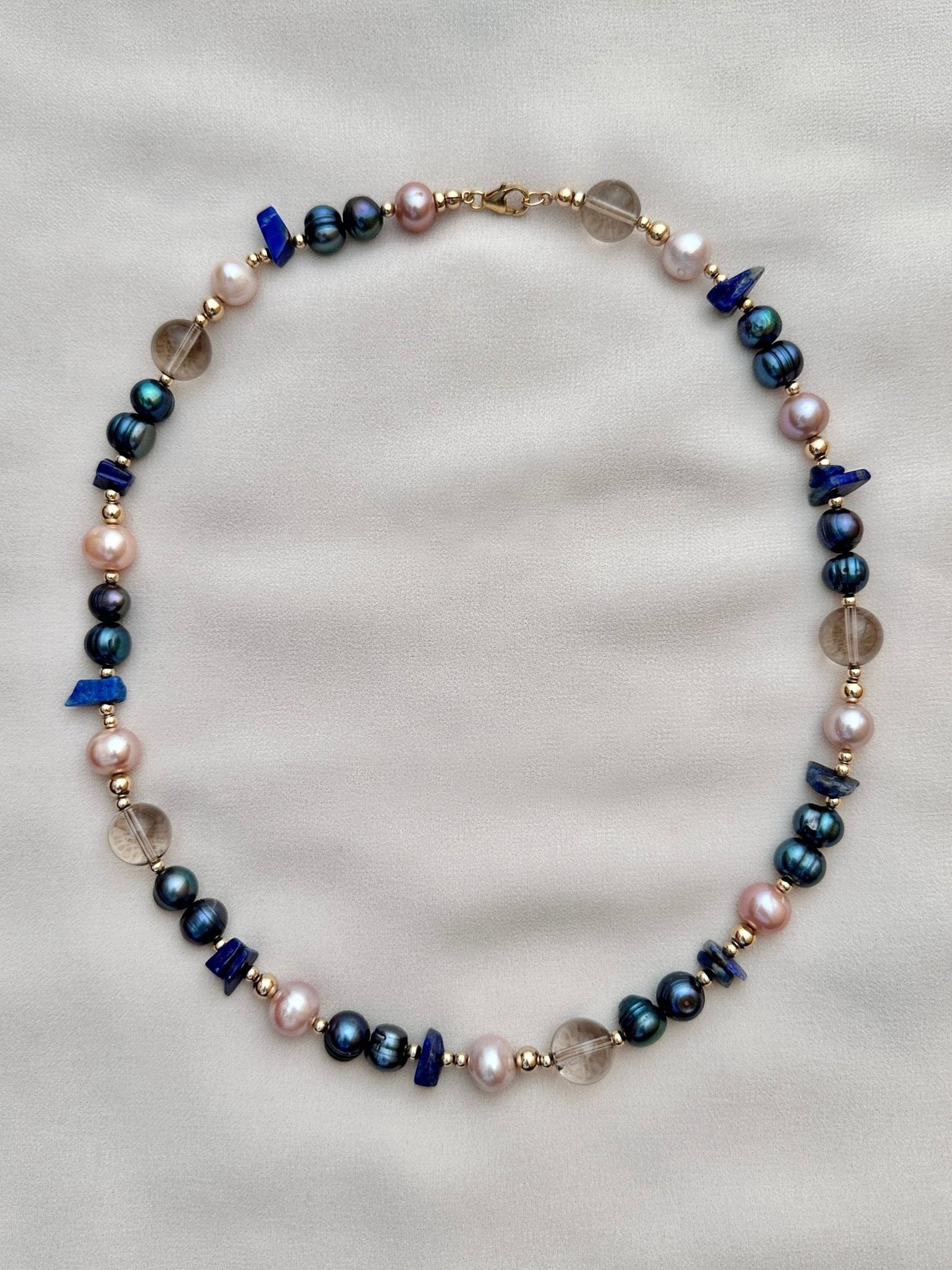 It features: an eclectic mix of freshwater pearls in soft pink and deep blue shades, interspersed with smoky quartz and vibrant lapis lazuli chips for a playful pop of color. The gold-filled accents add a touch of warmth and sophistication.