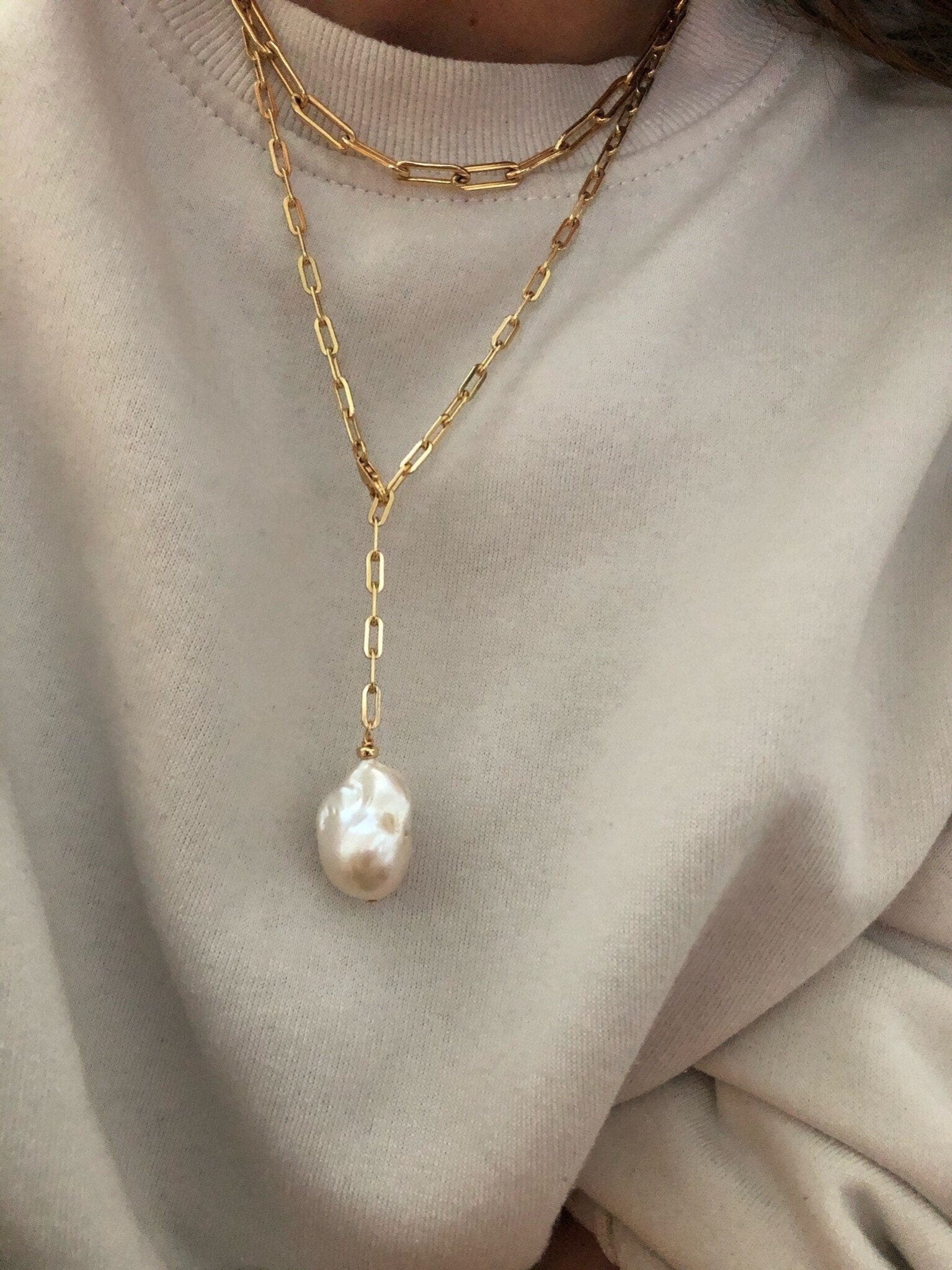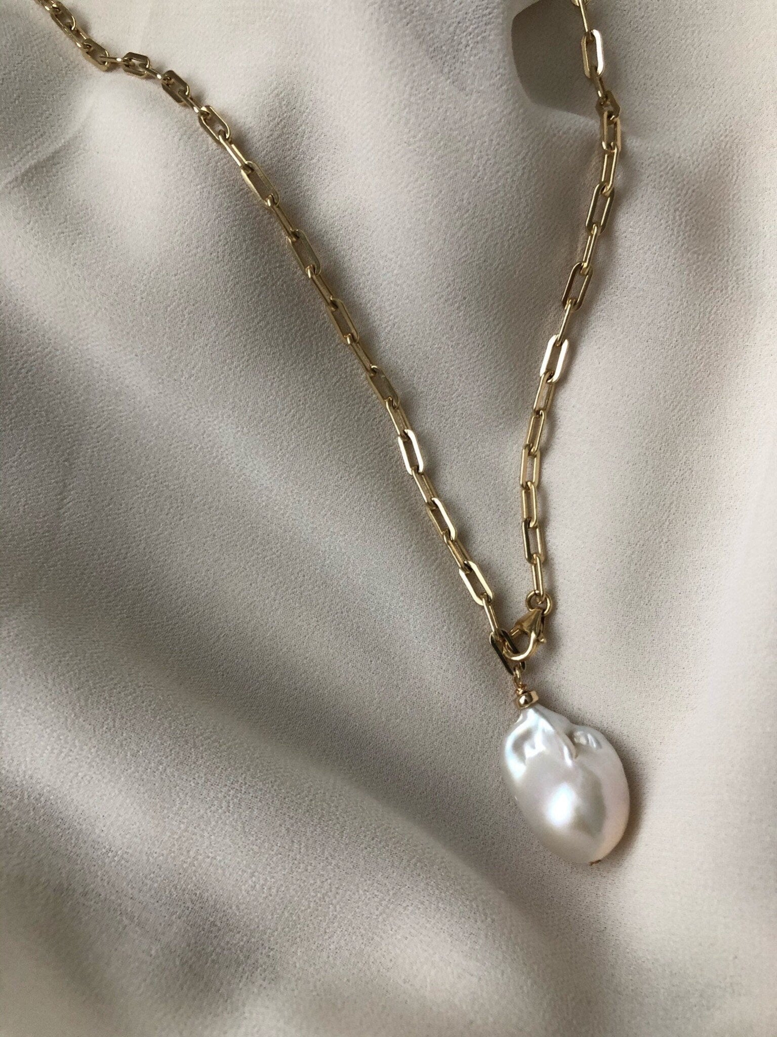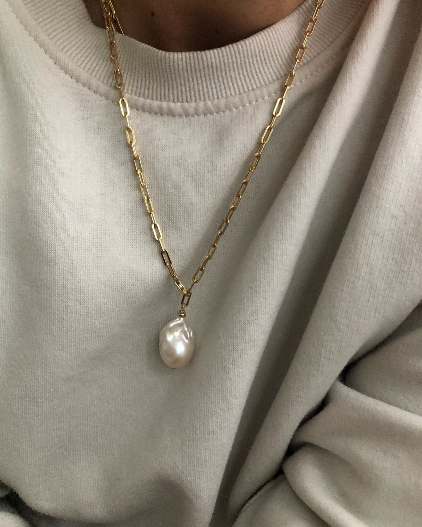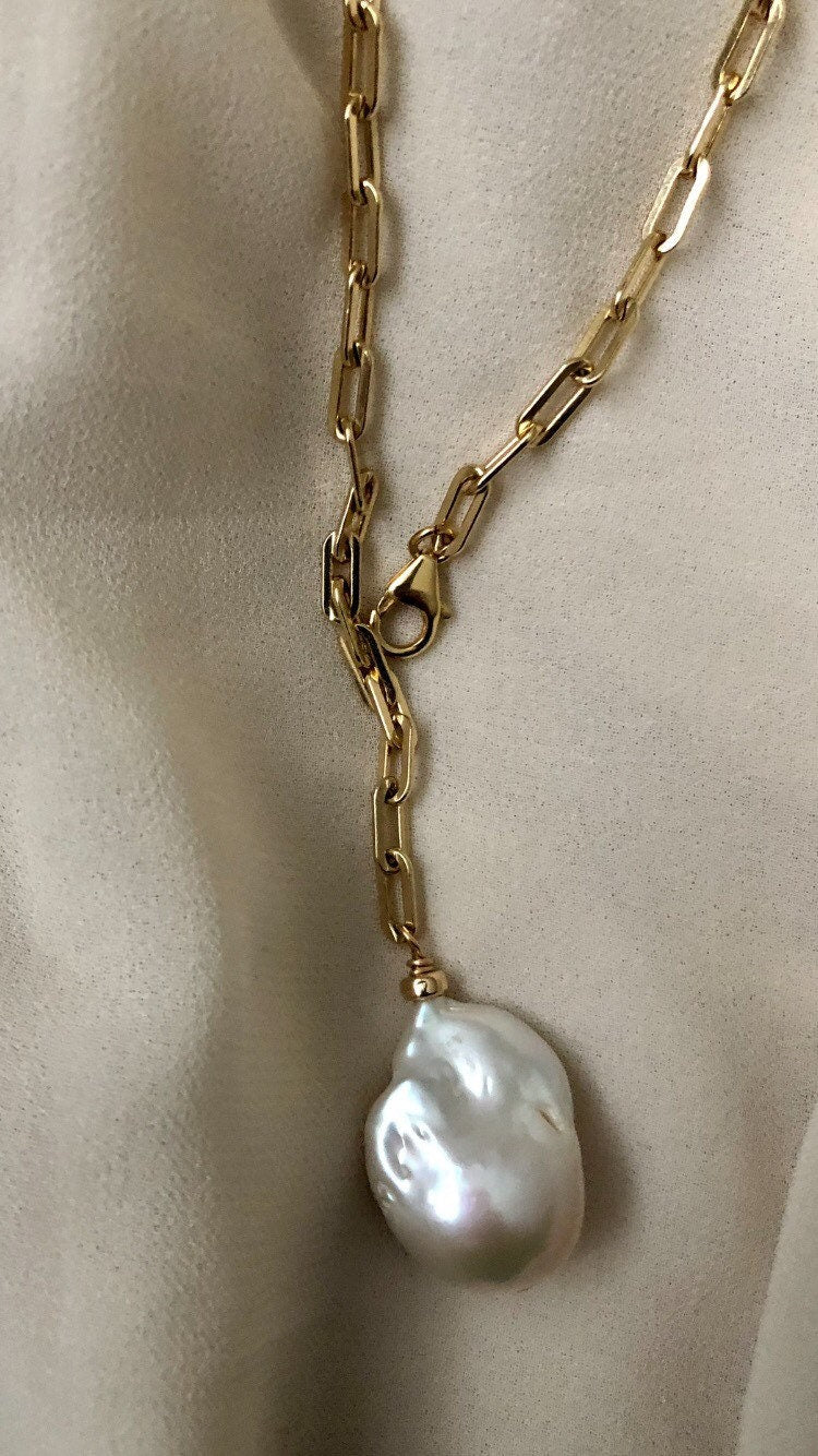 A large baroque pearl pendant on a unique 14kt gold-filled, thick paperclip chain.