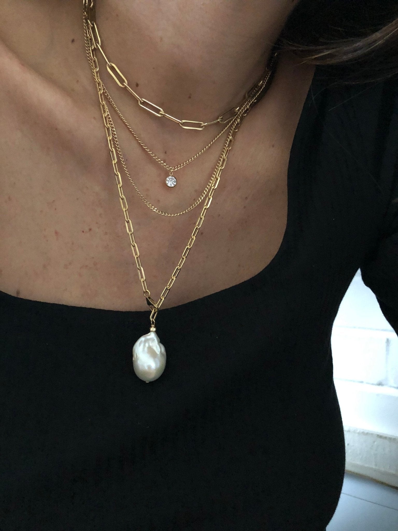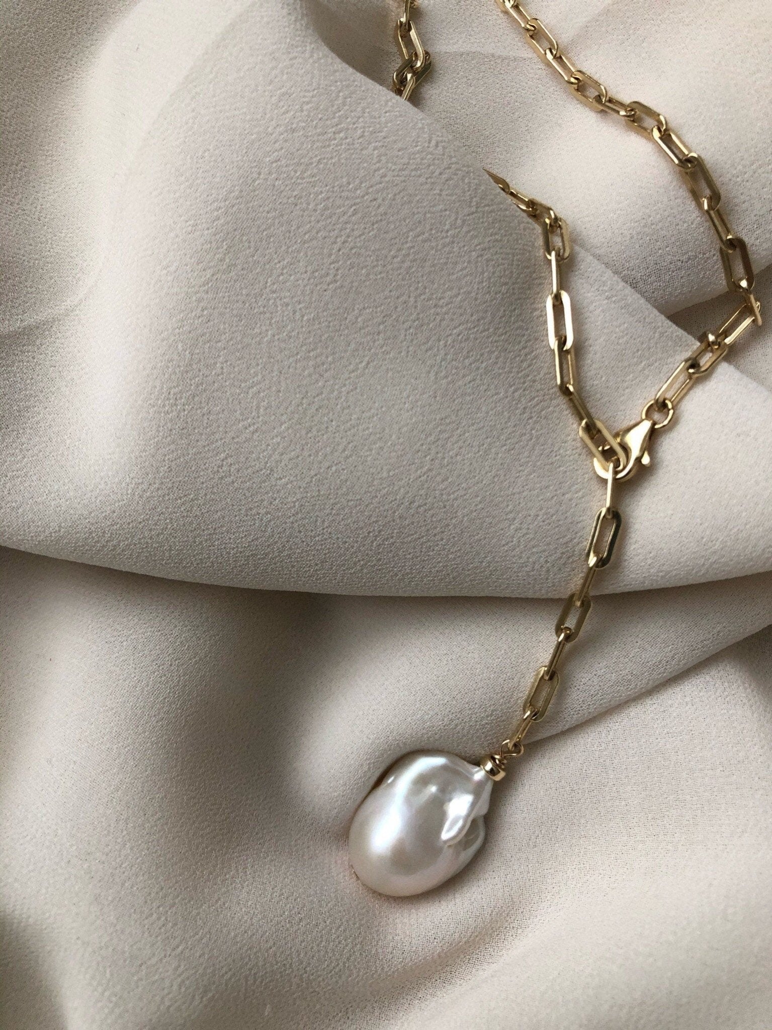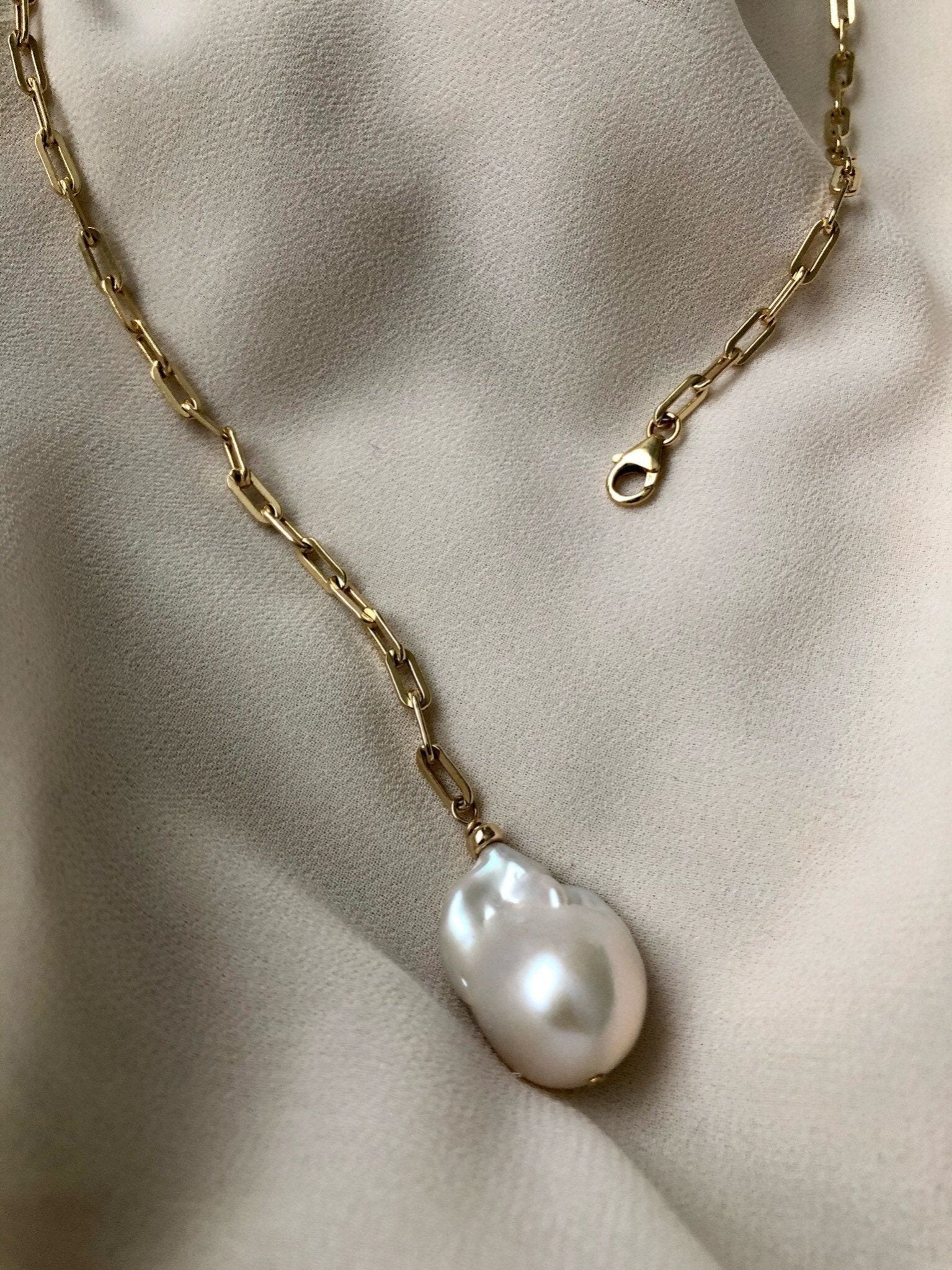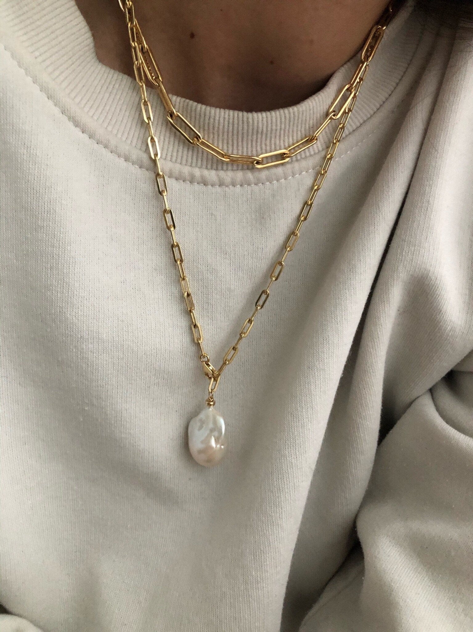 A large baroque pearl pendant on a unique 14kt gold-filled, thick paperclip chain.