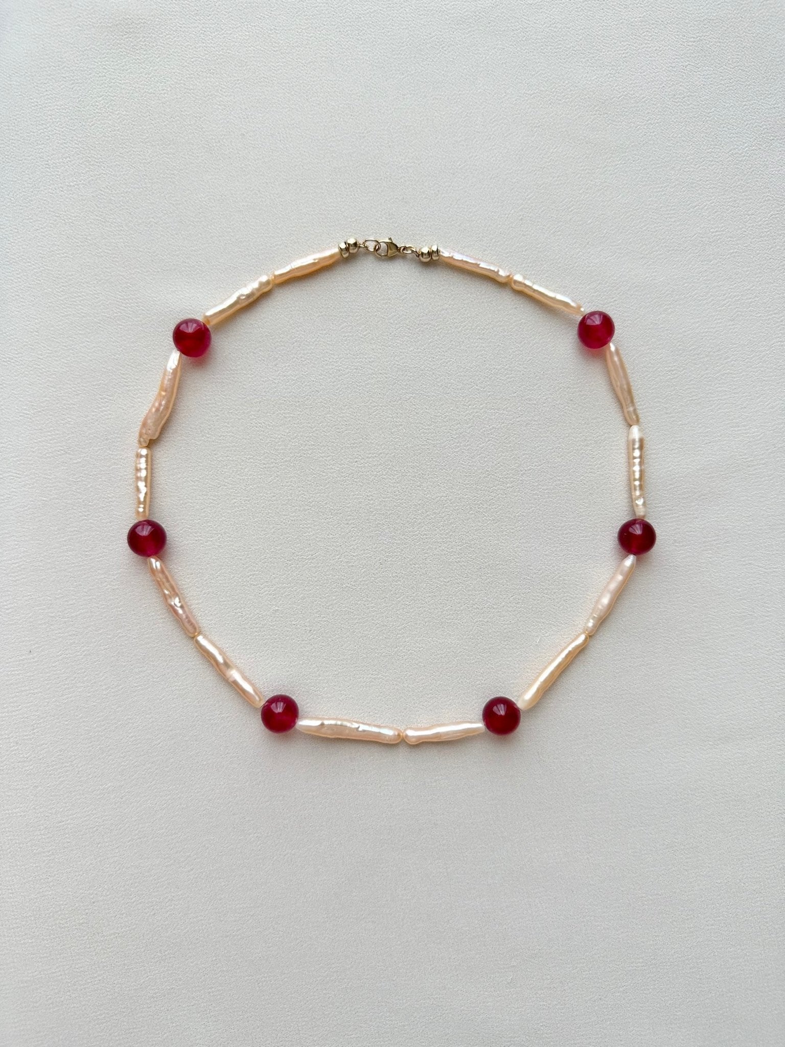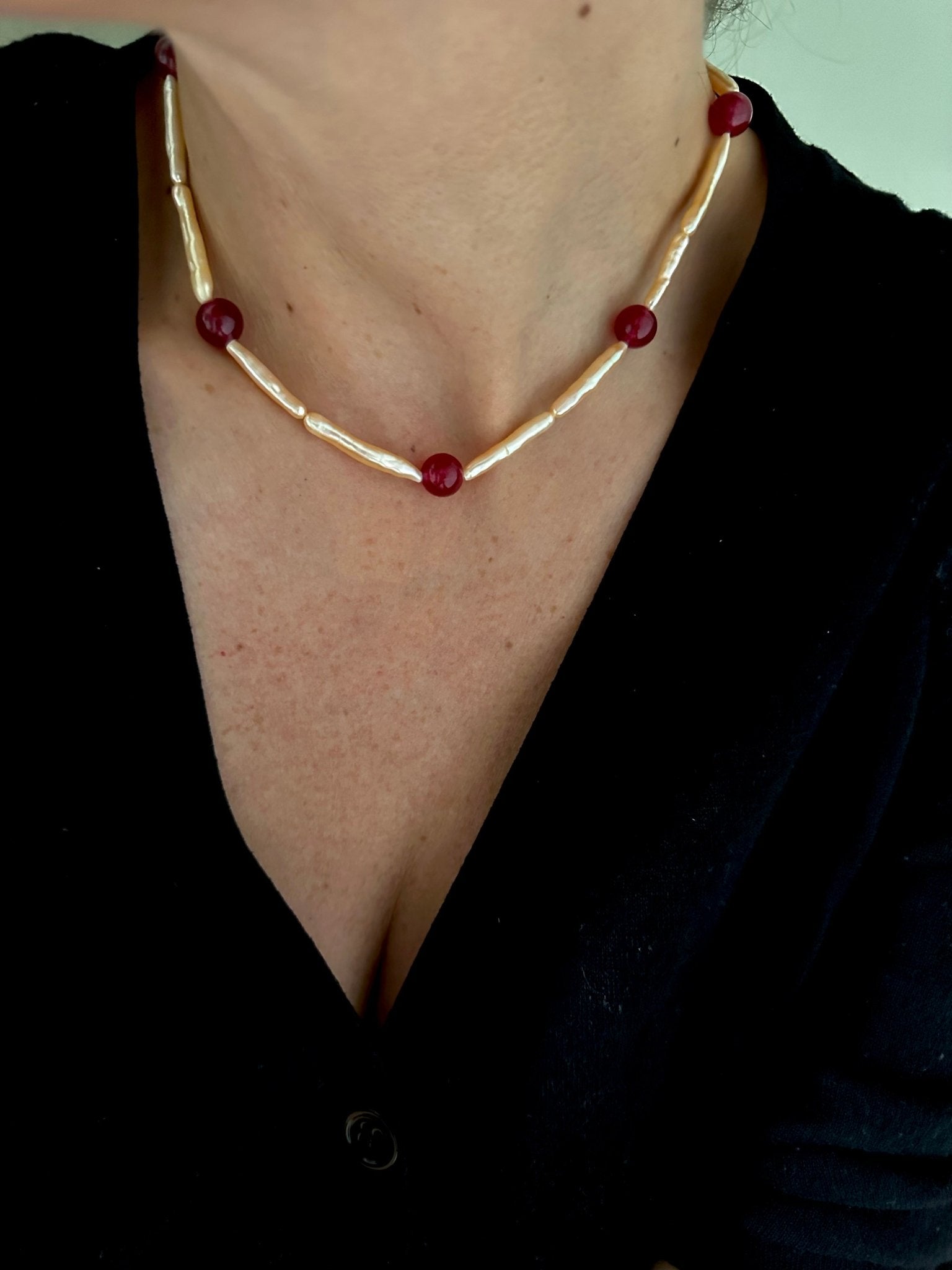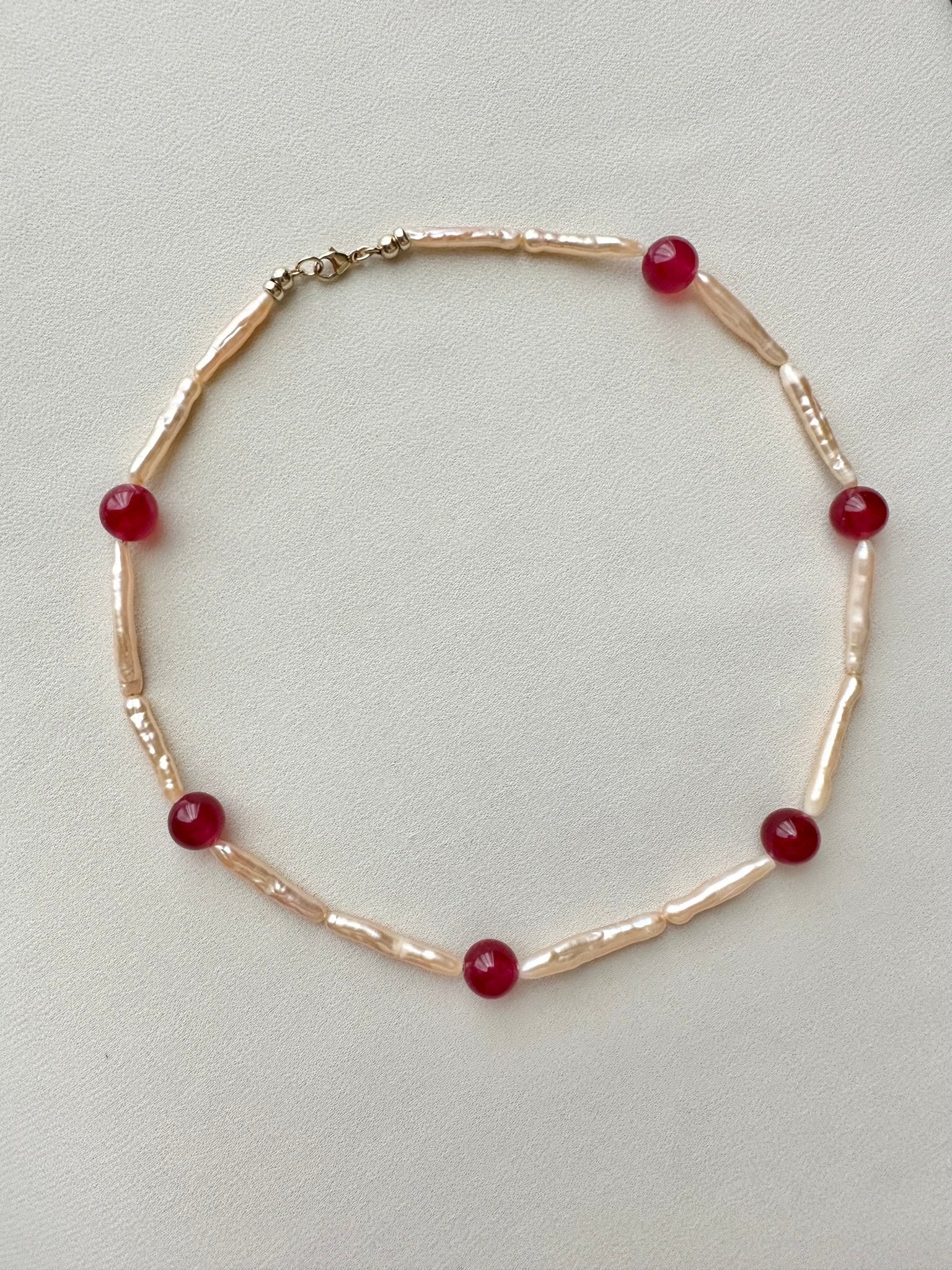 A unique pink biwa pearl and red jade gemstones necklace with 14kt gold filled closures make this a stand out piece.
