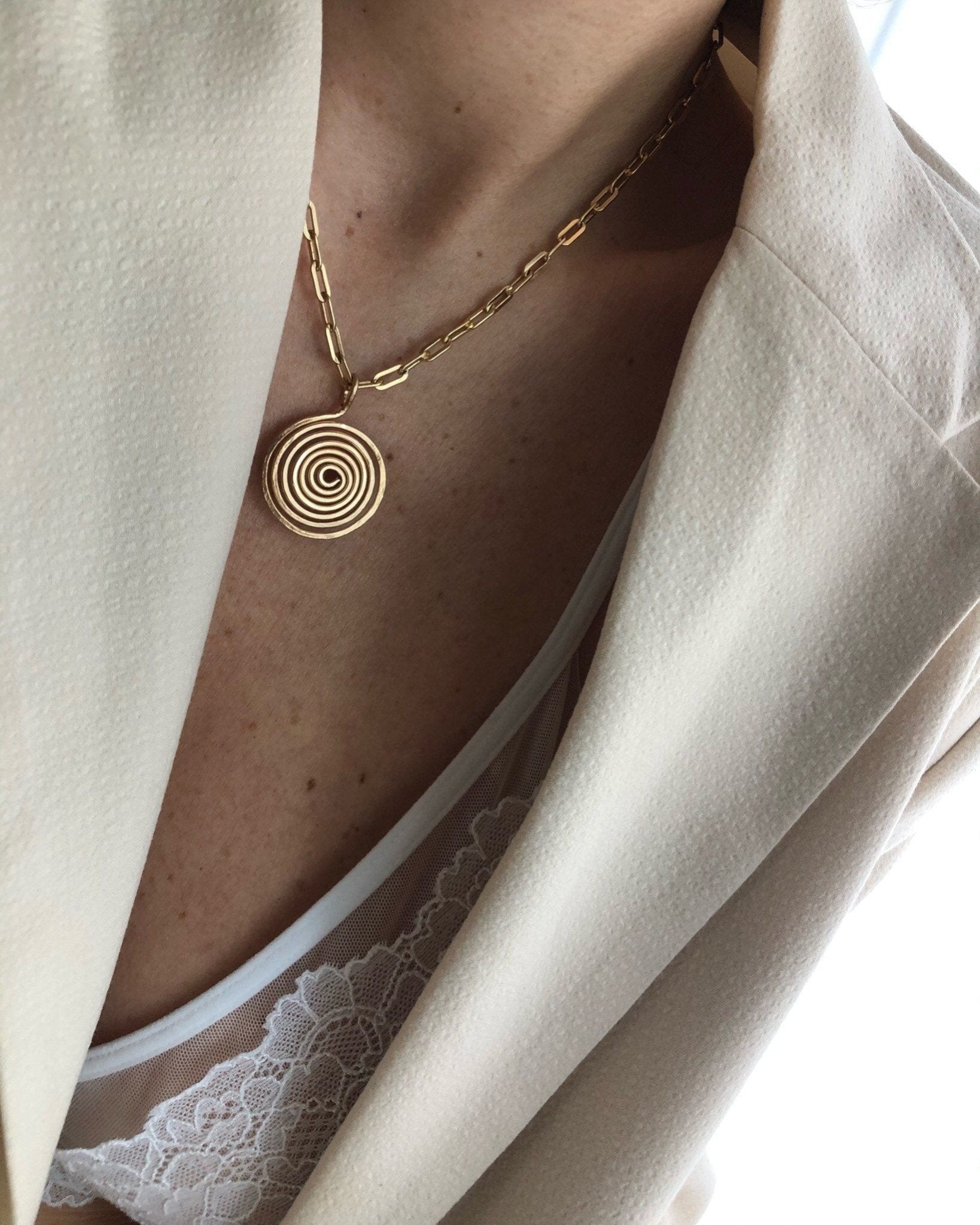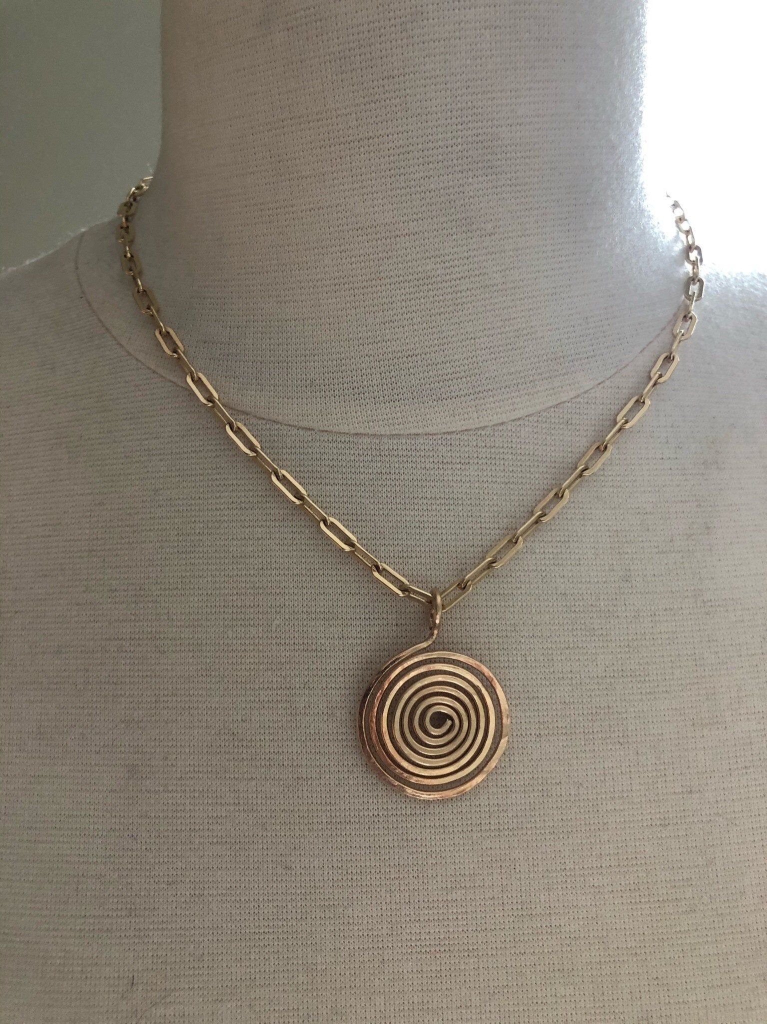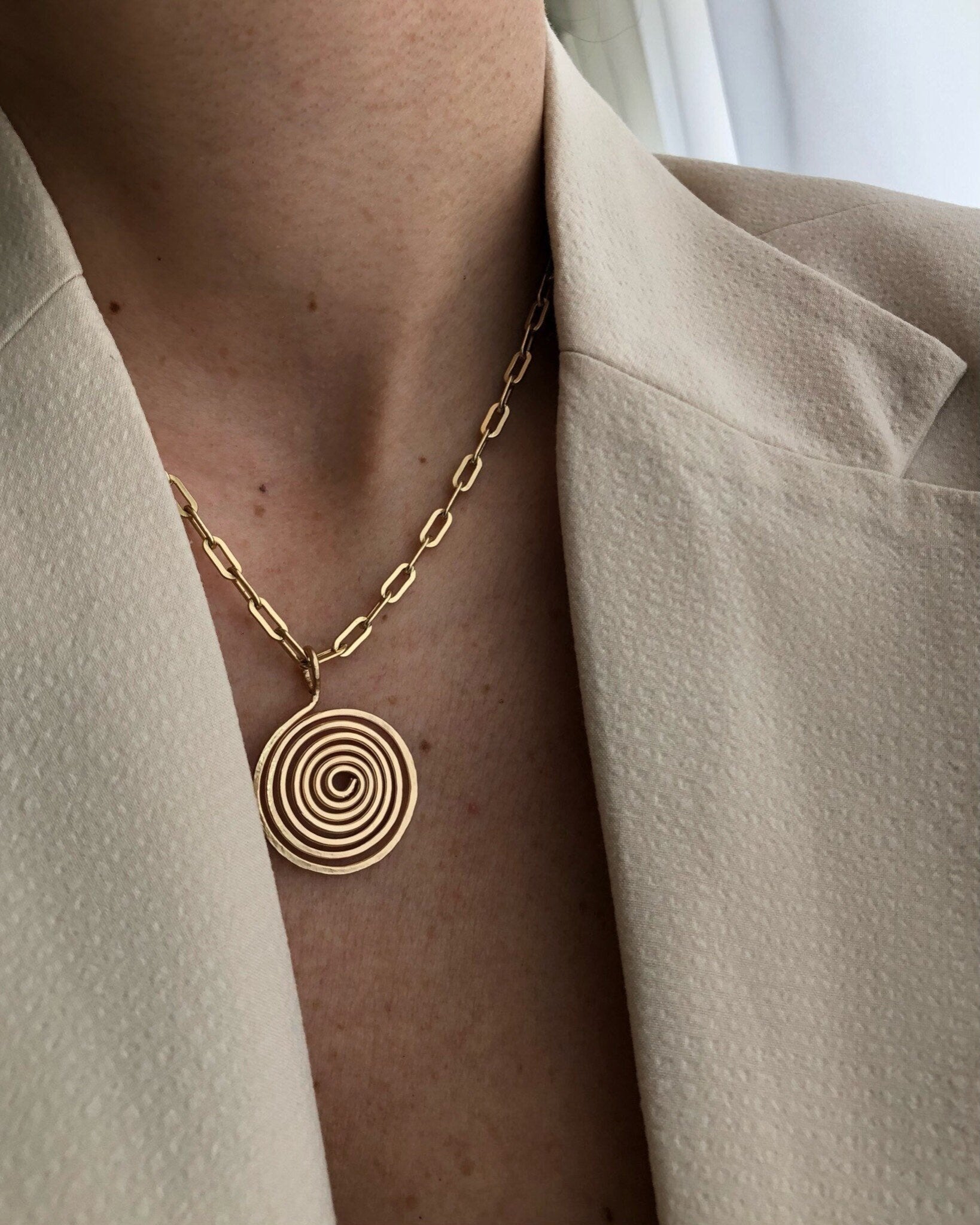 A hand-hammered spiral pendant adorned by a high-quality 14kt gold-filled thick chain.