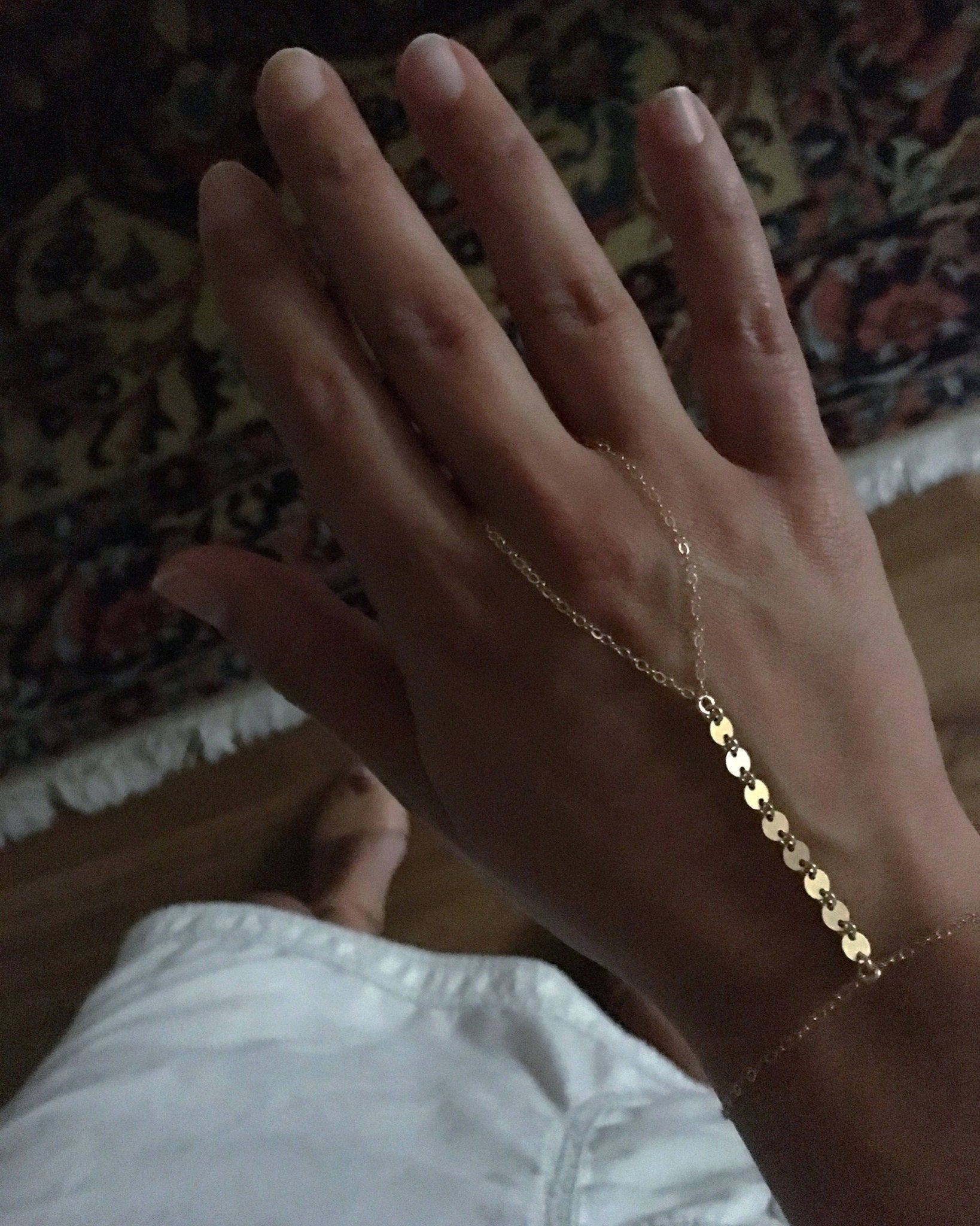 A gorgeous, dainty hand bracelet with a disc chain detail.