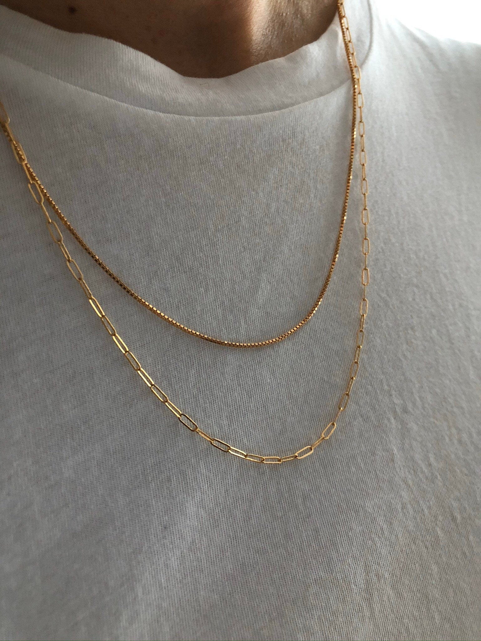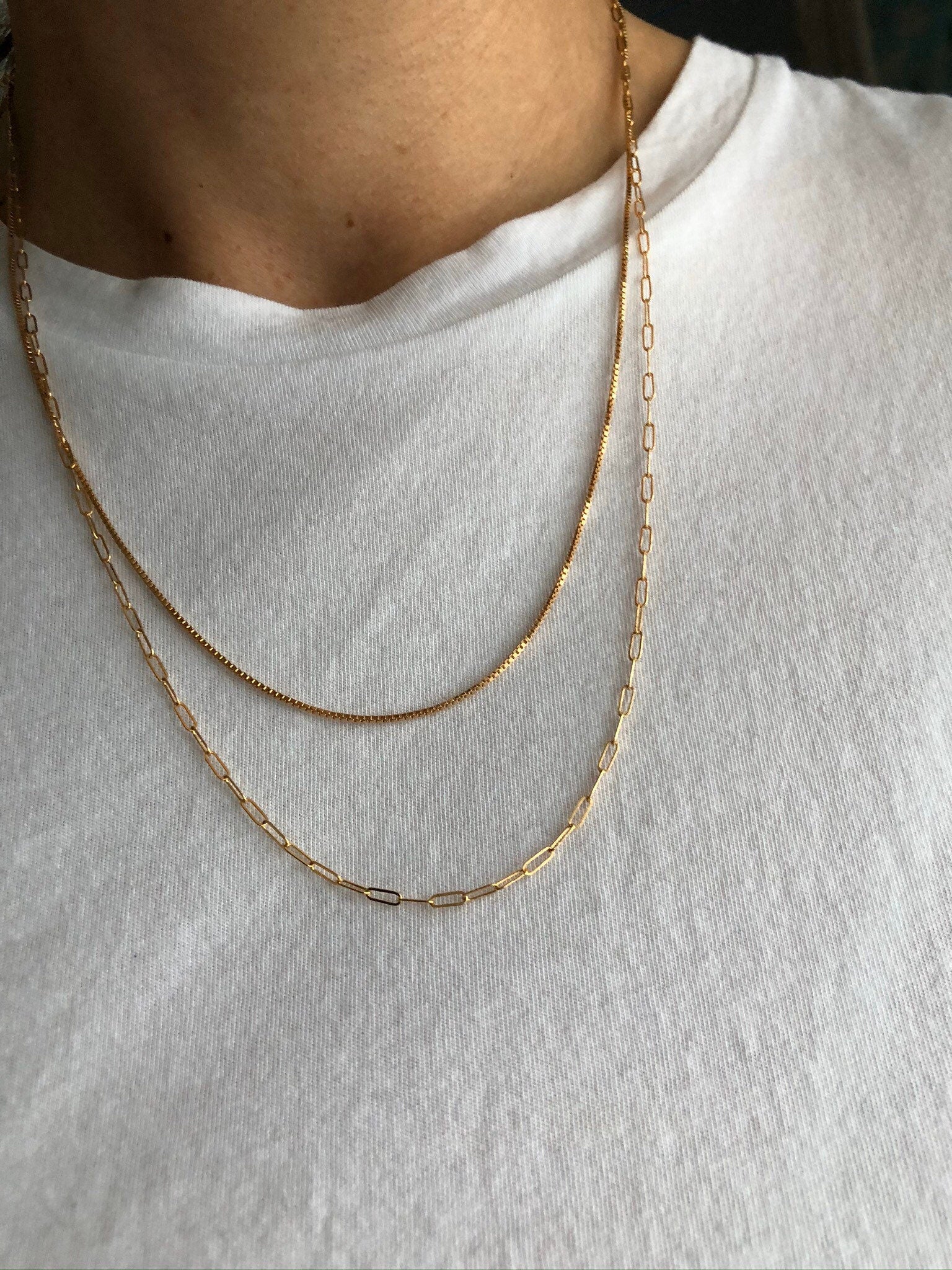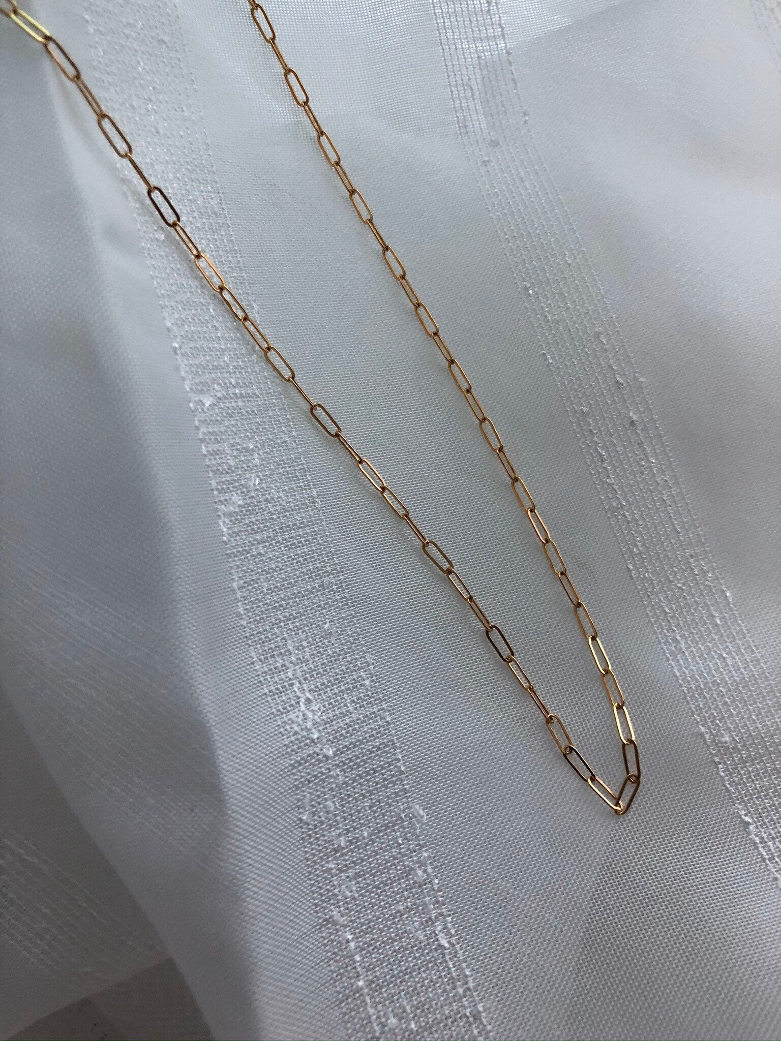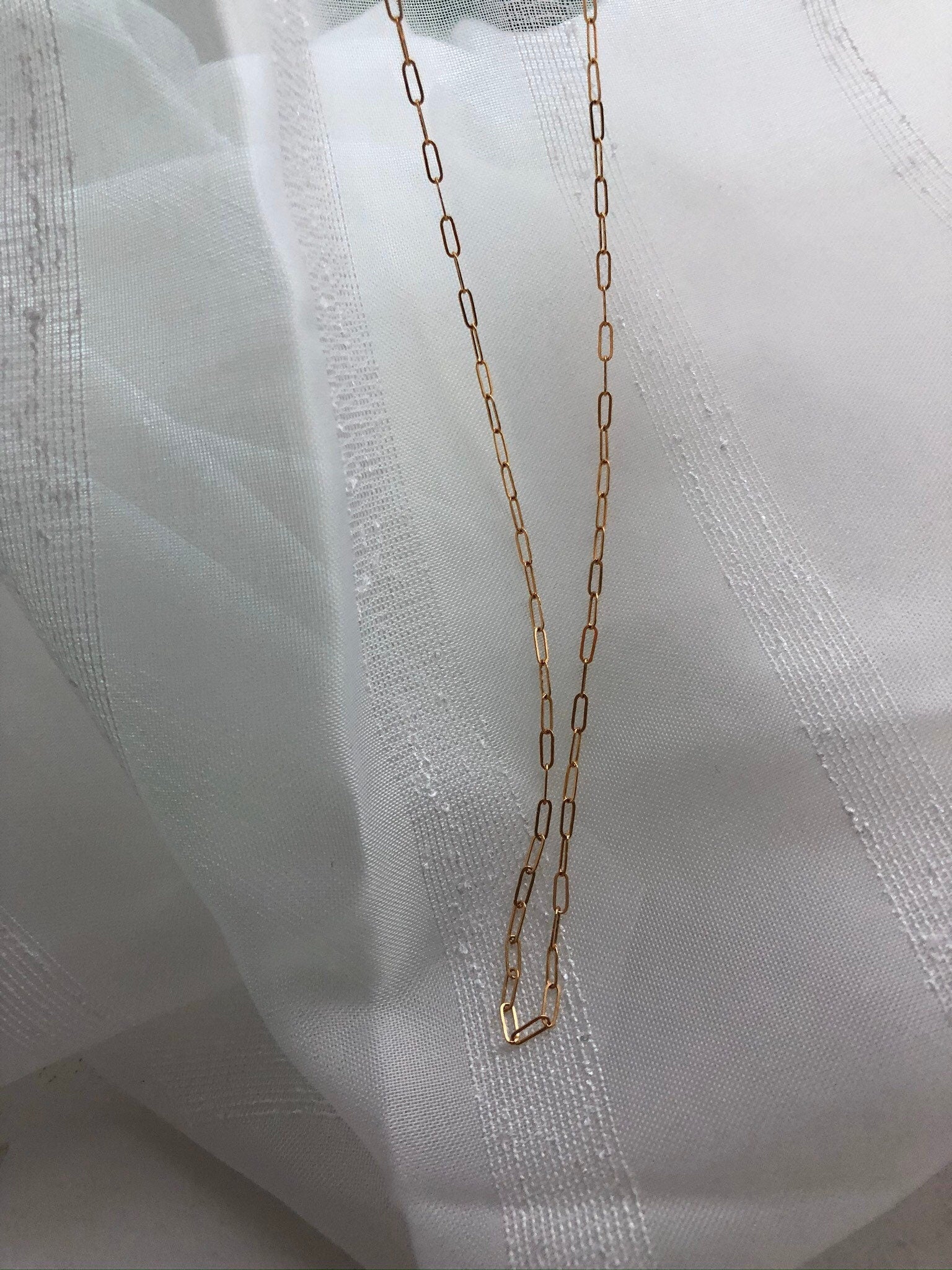 A minimal, 14kt gold-filled rectangle chain necklace also known as a paperclip chain. This is a modern necklace that can be worn on its own or layered. Simple and elegant over bare skin or on a blouse.