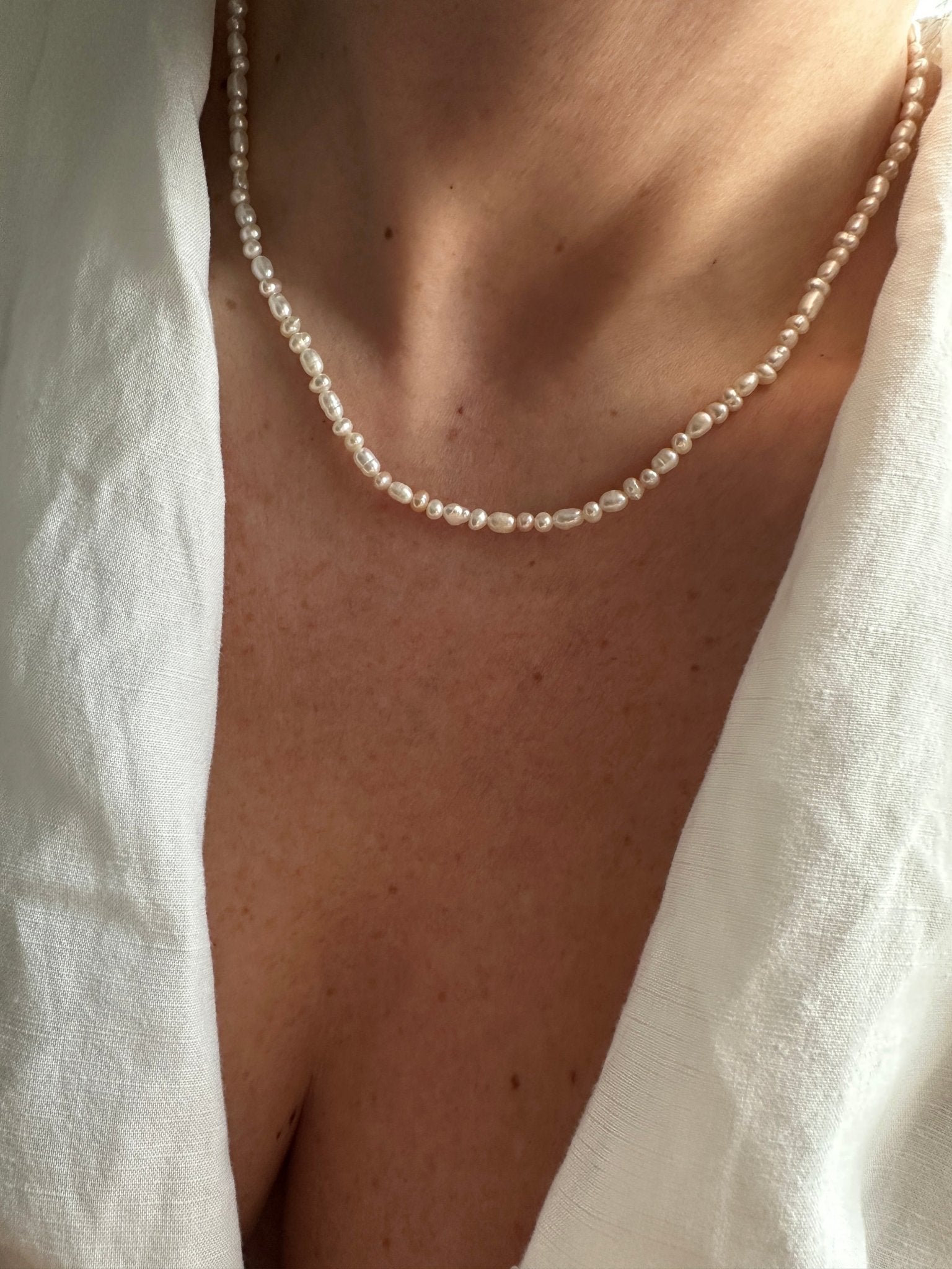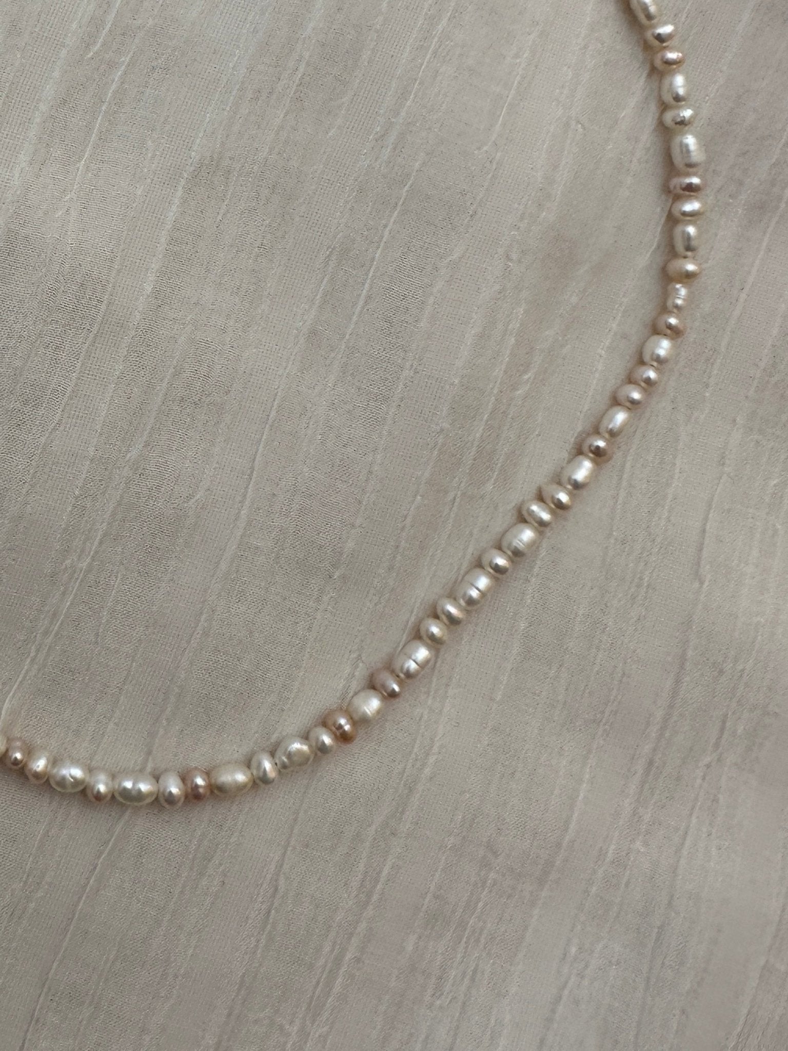 A beautiful mix of baroque white and pink pearls with 14kt gold filled details. Perfect on its own or for layering with other pieces.