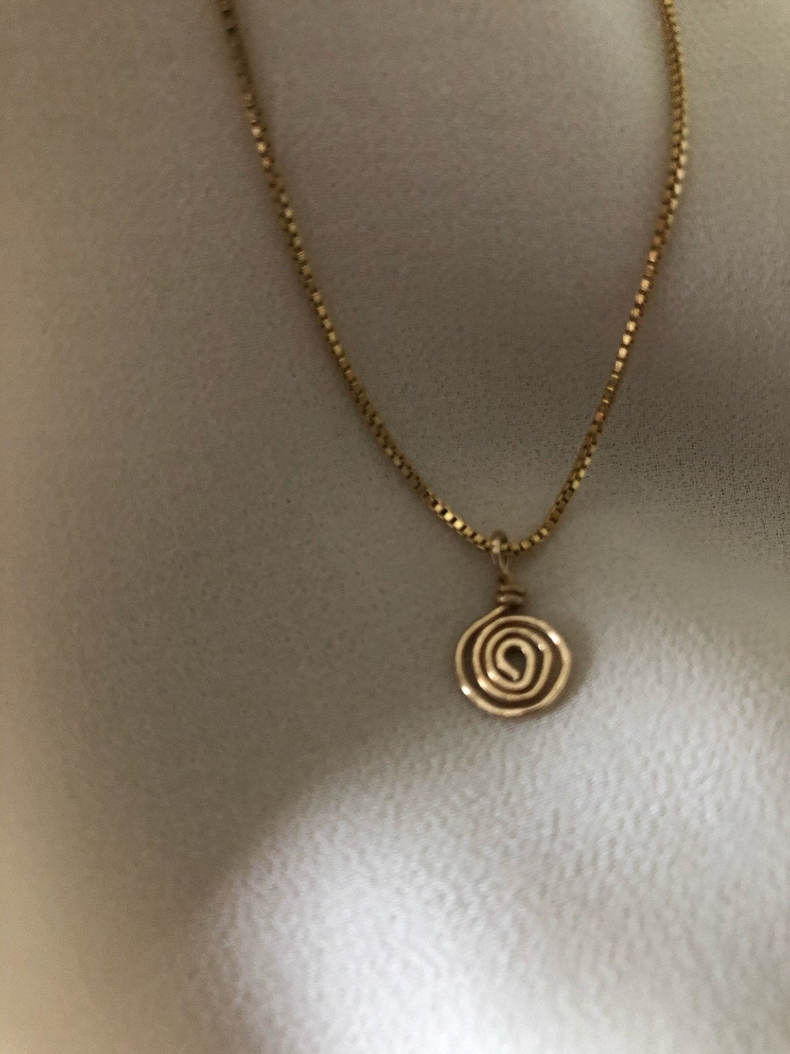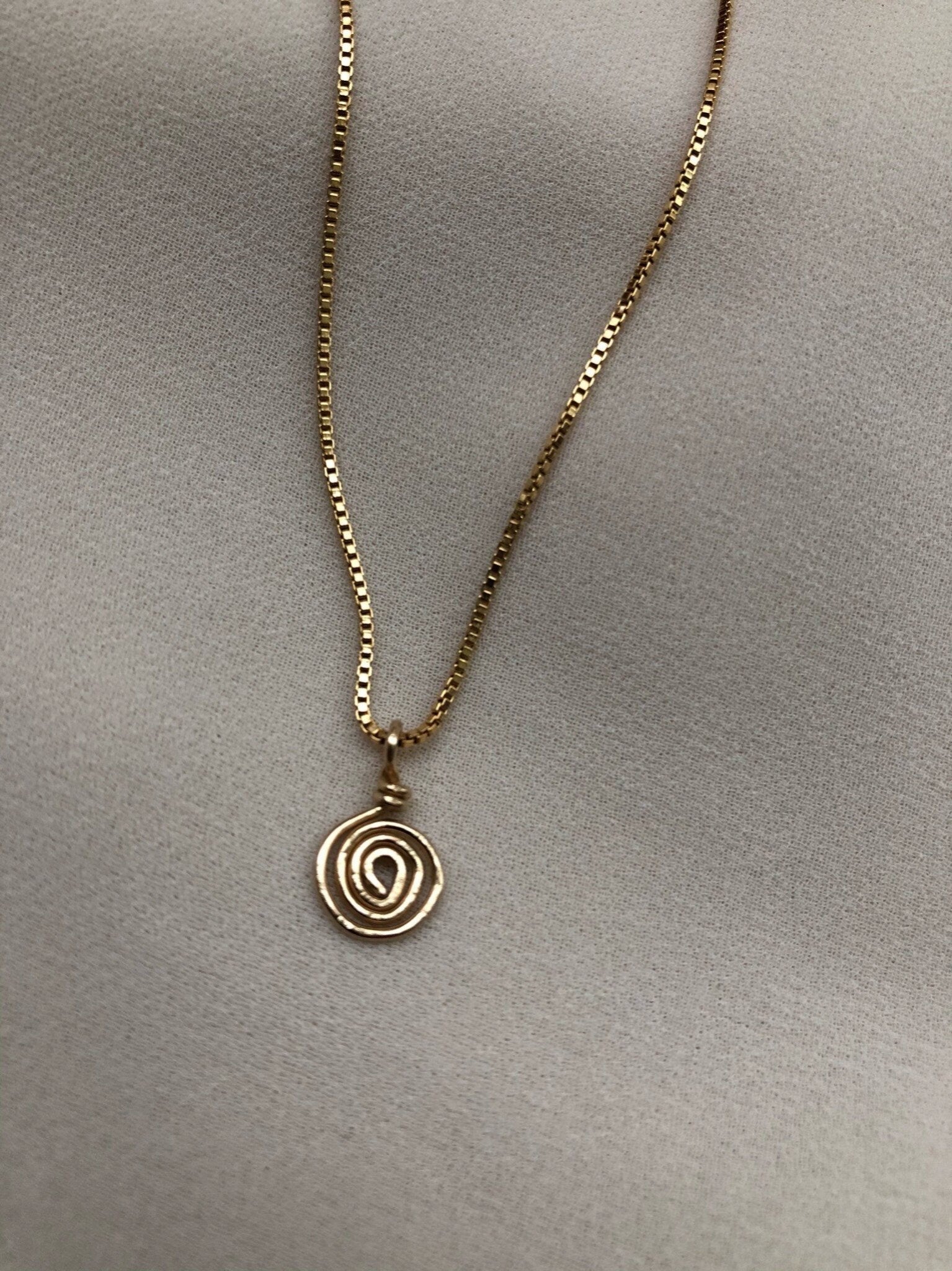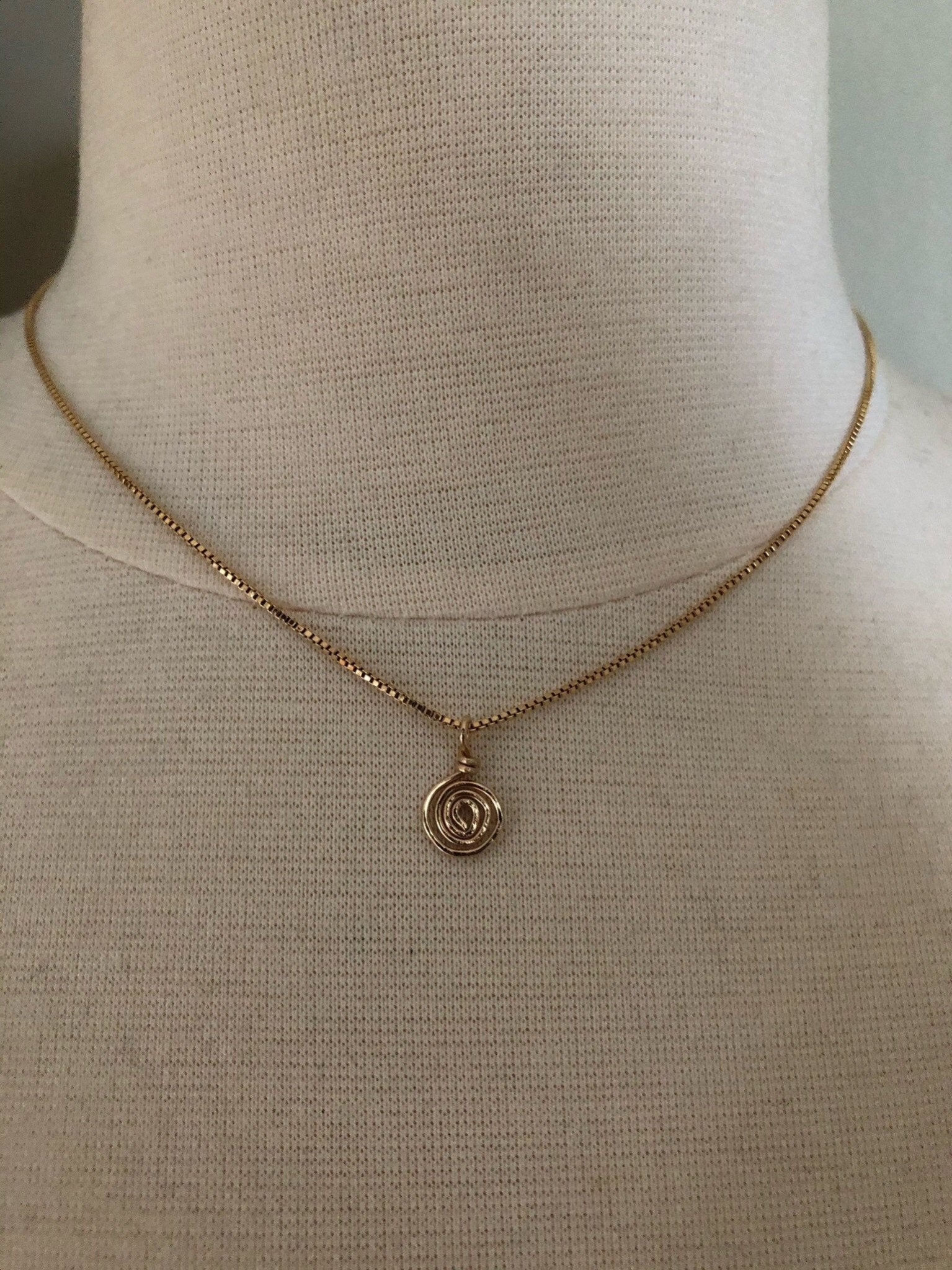 A minimal, 14kt gold filled dainty box chain necklace with a hand sculpted/ hammered mini spiral pendant that can be worn on its own or layered.