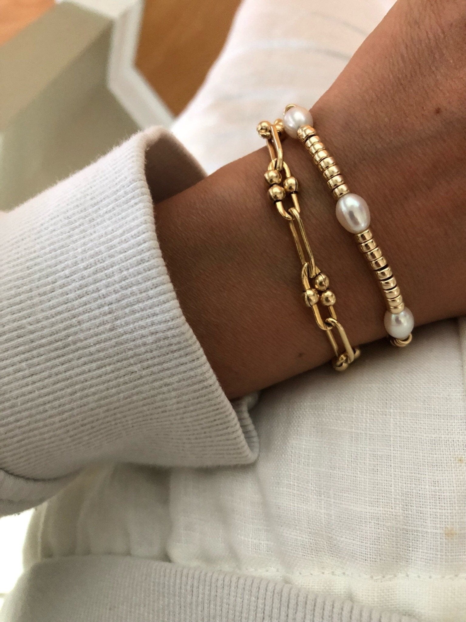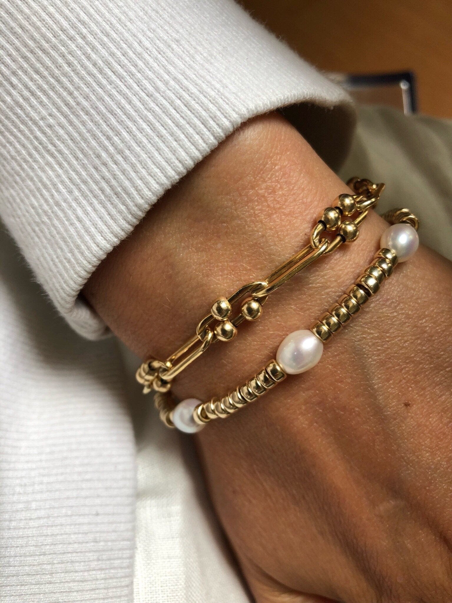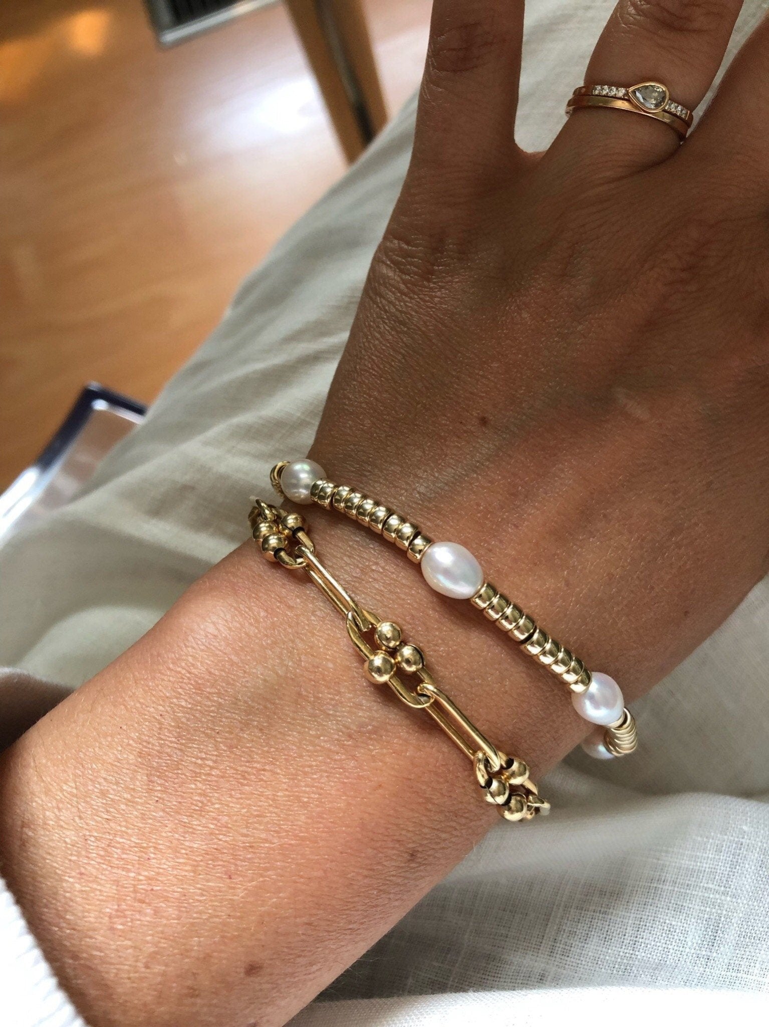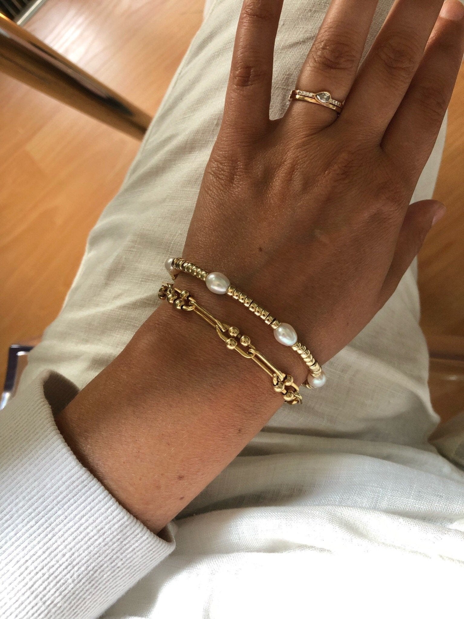 A modern gold and pearl bracelet that looks great on its own or stacked.