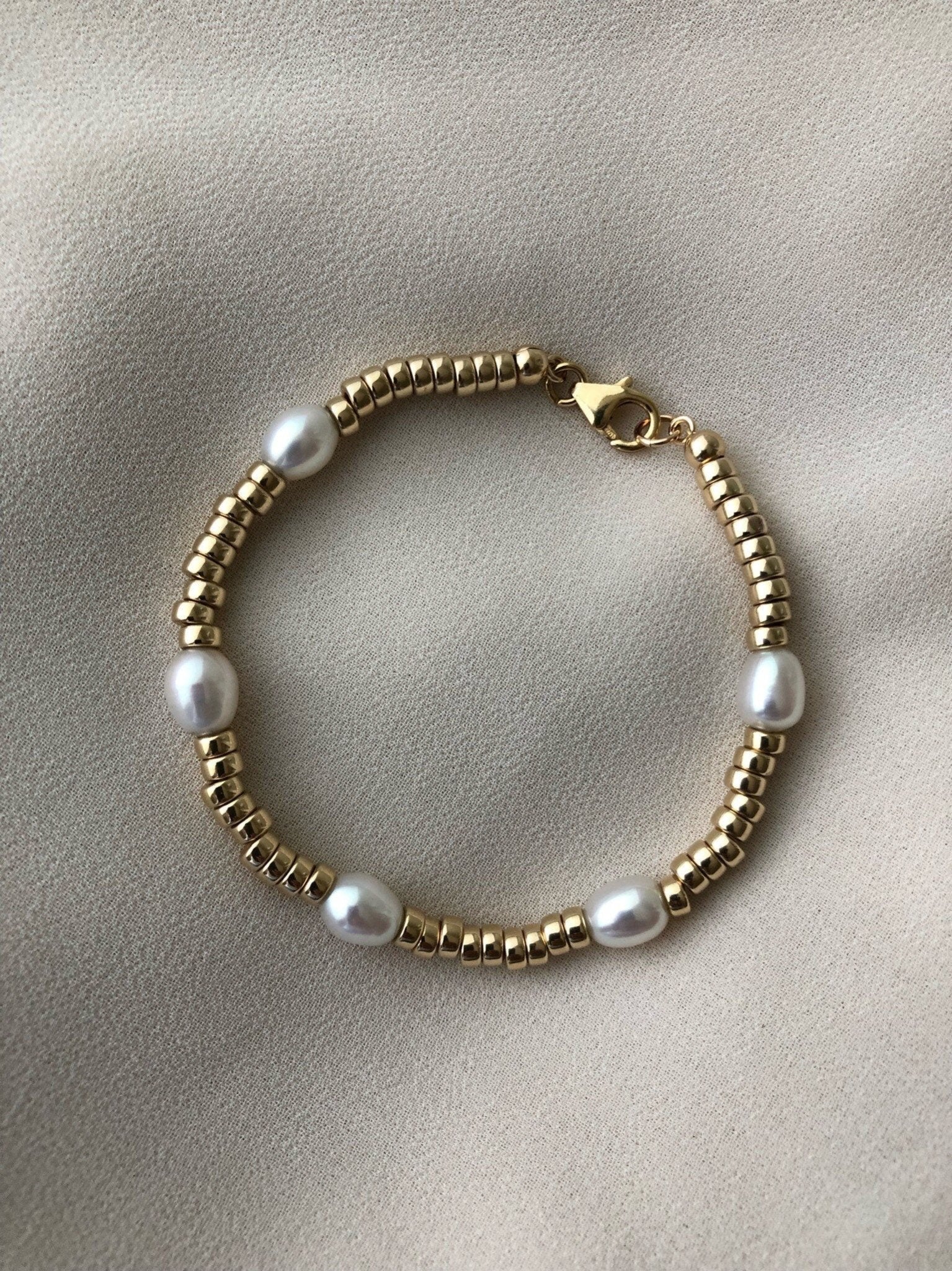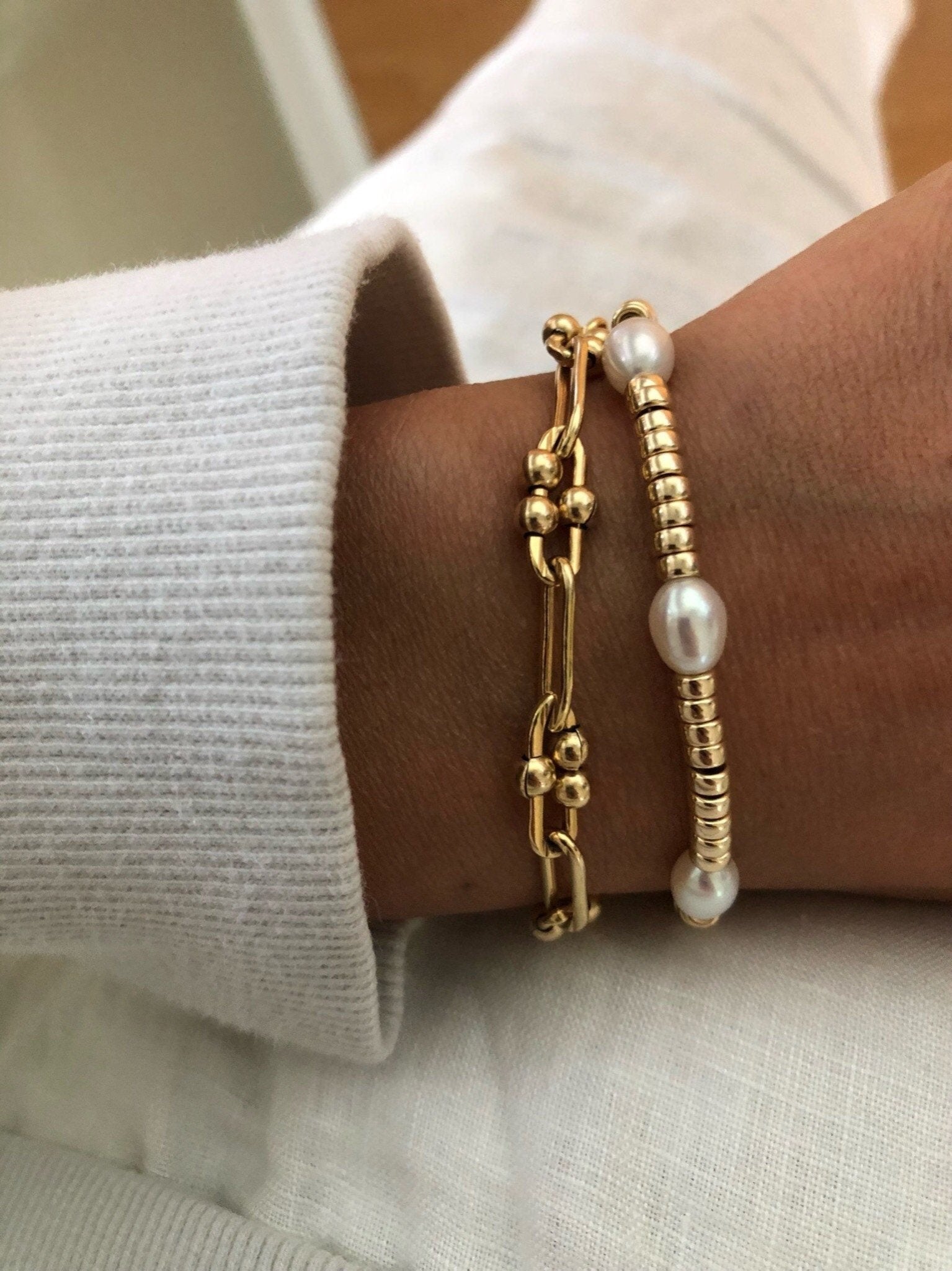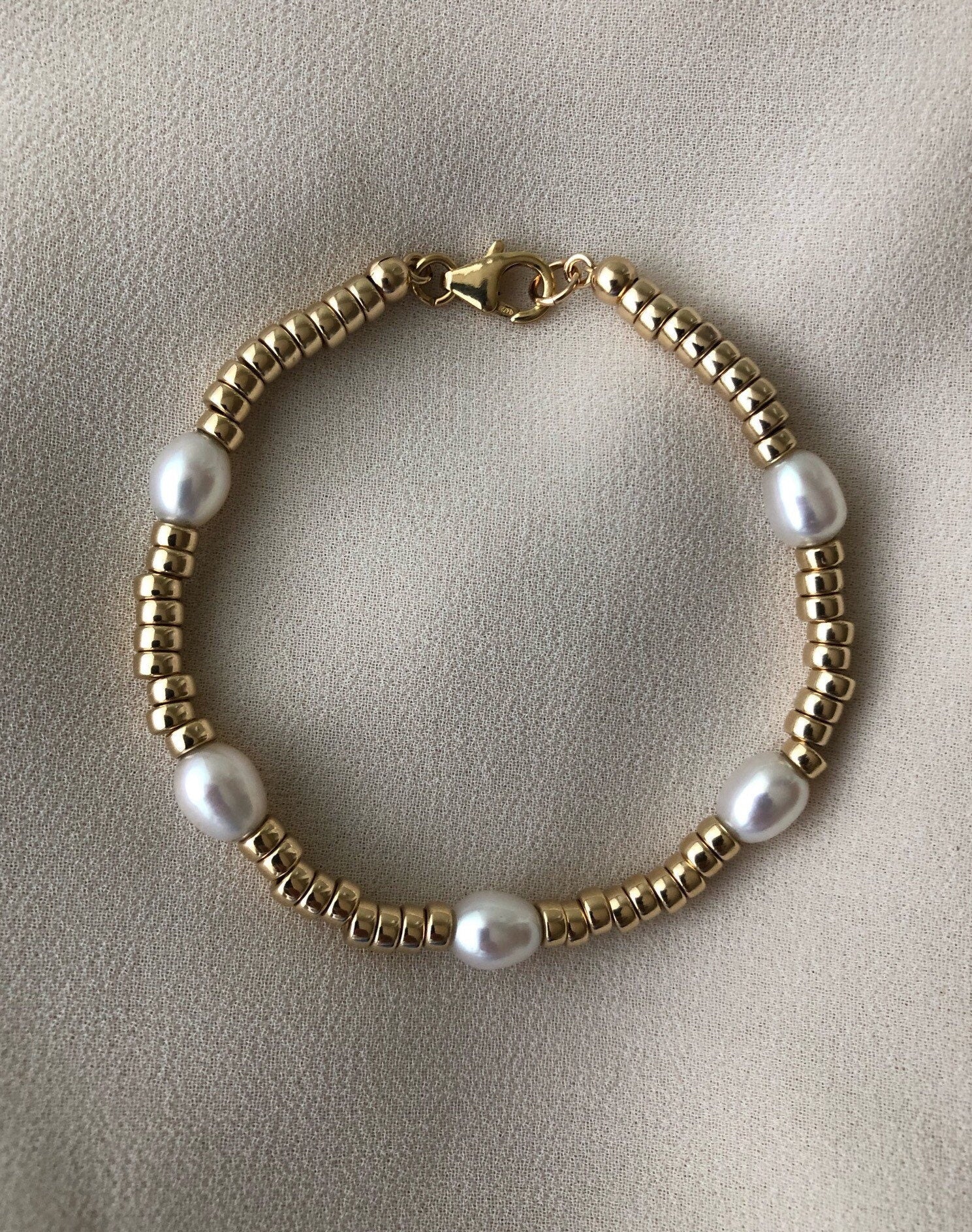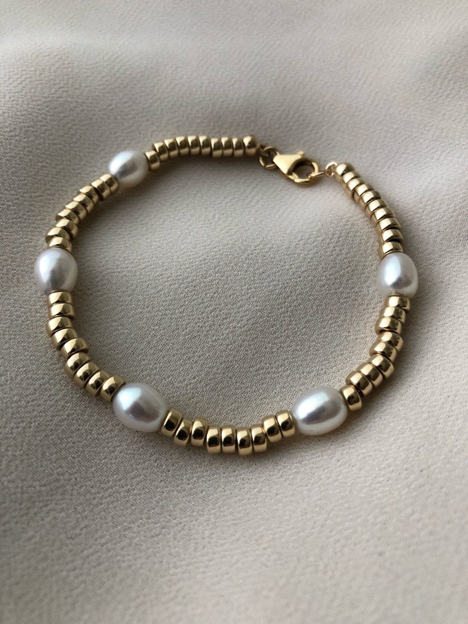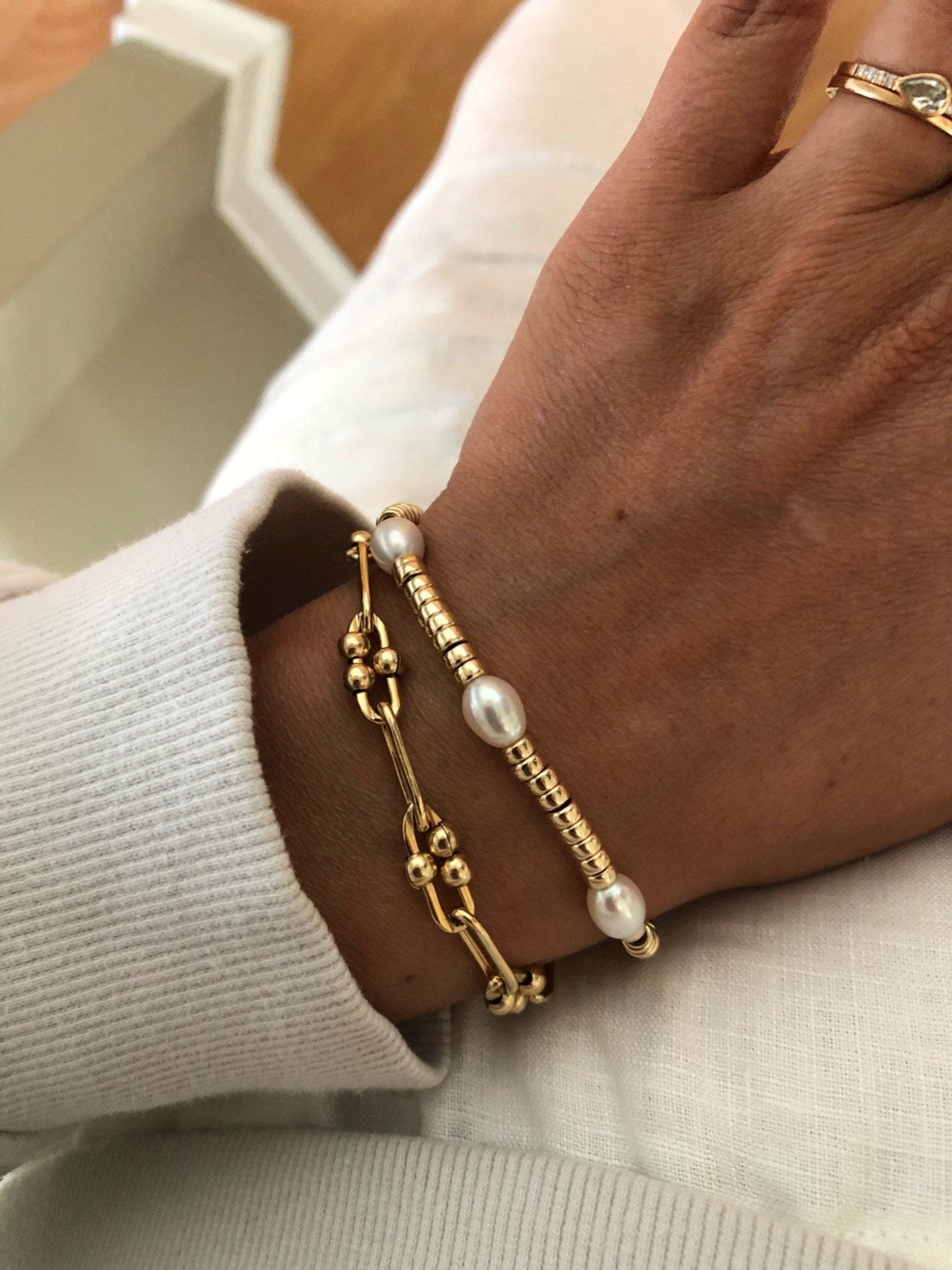A modern gold and pearl bracelet that looks great on its own or stacked.