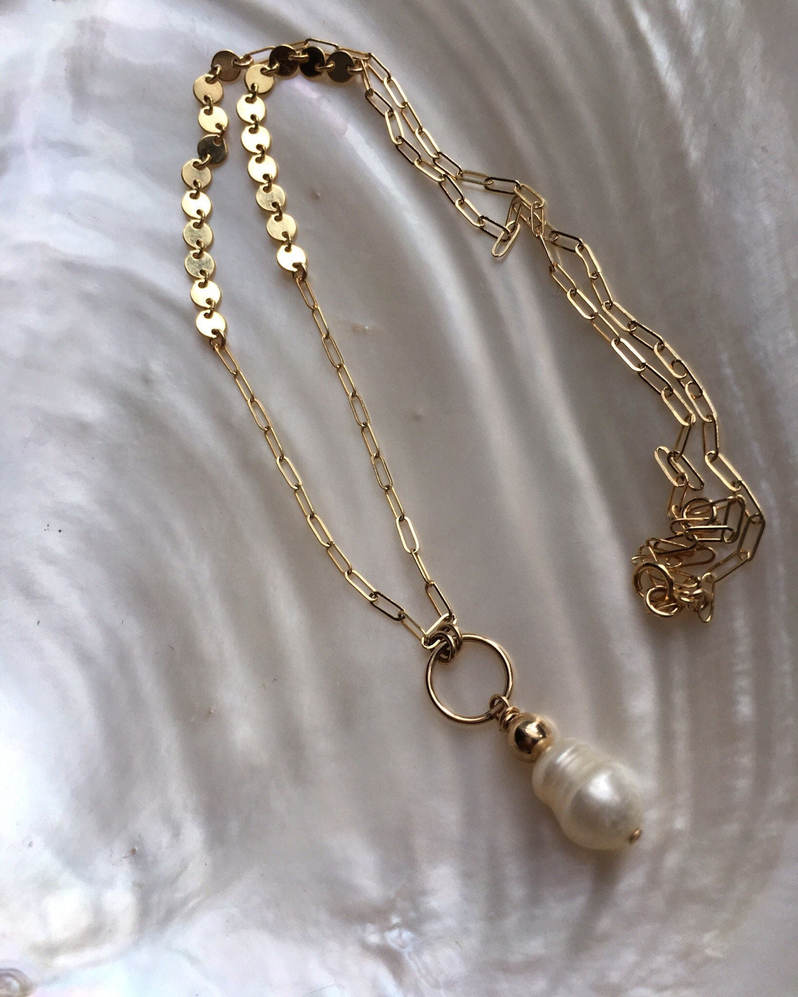 A large baroque freshwater pearl pendant on a unique gold-filled thick paperclip chain.