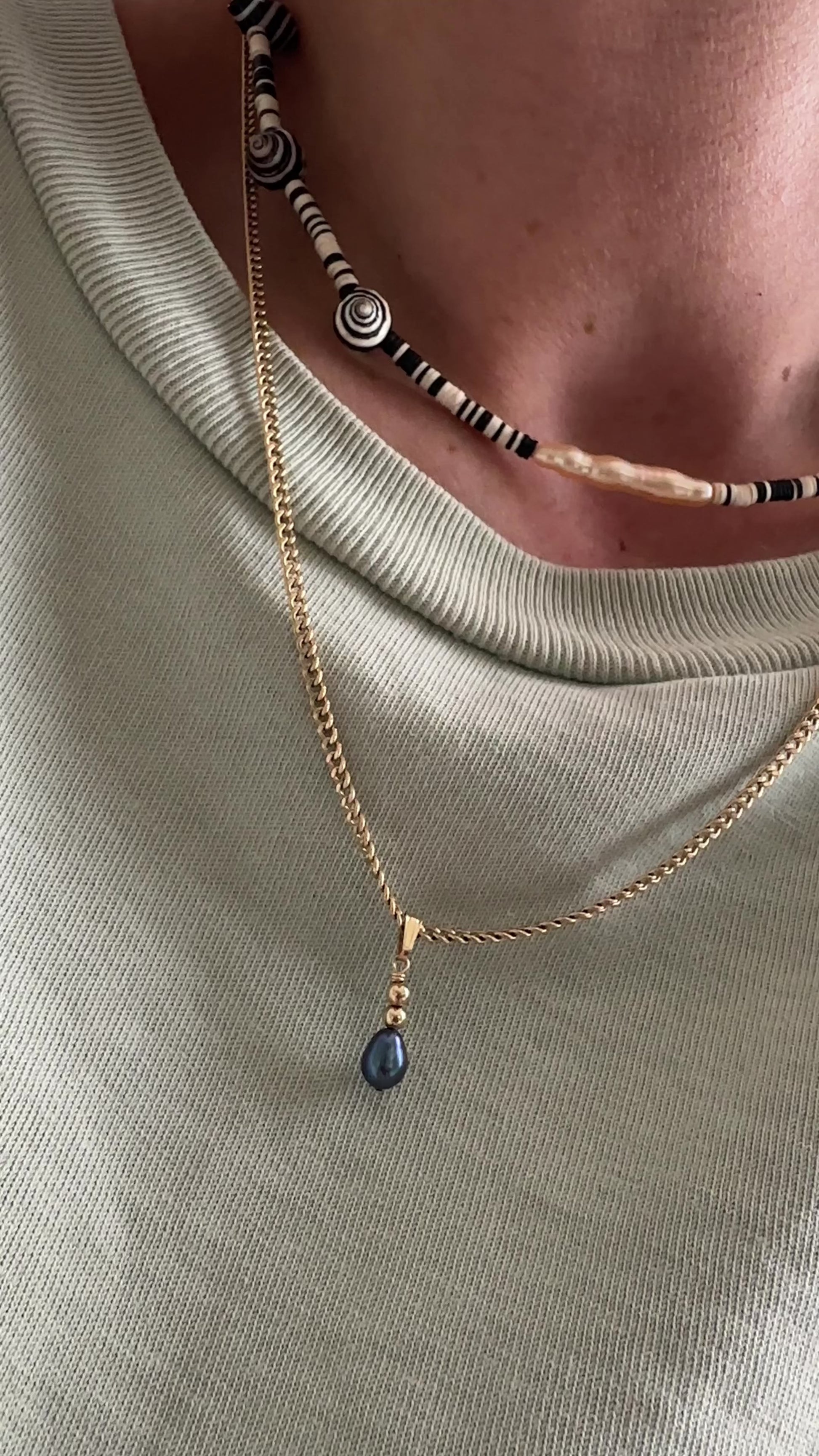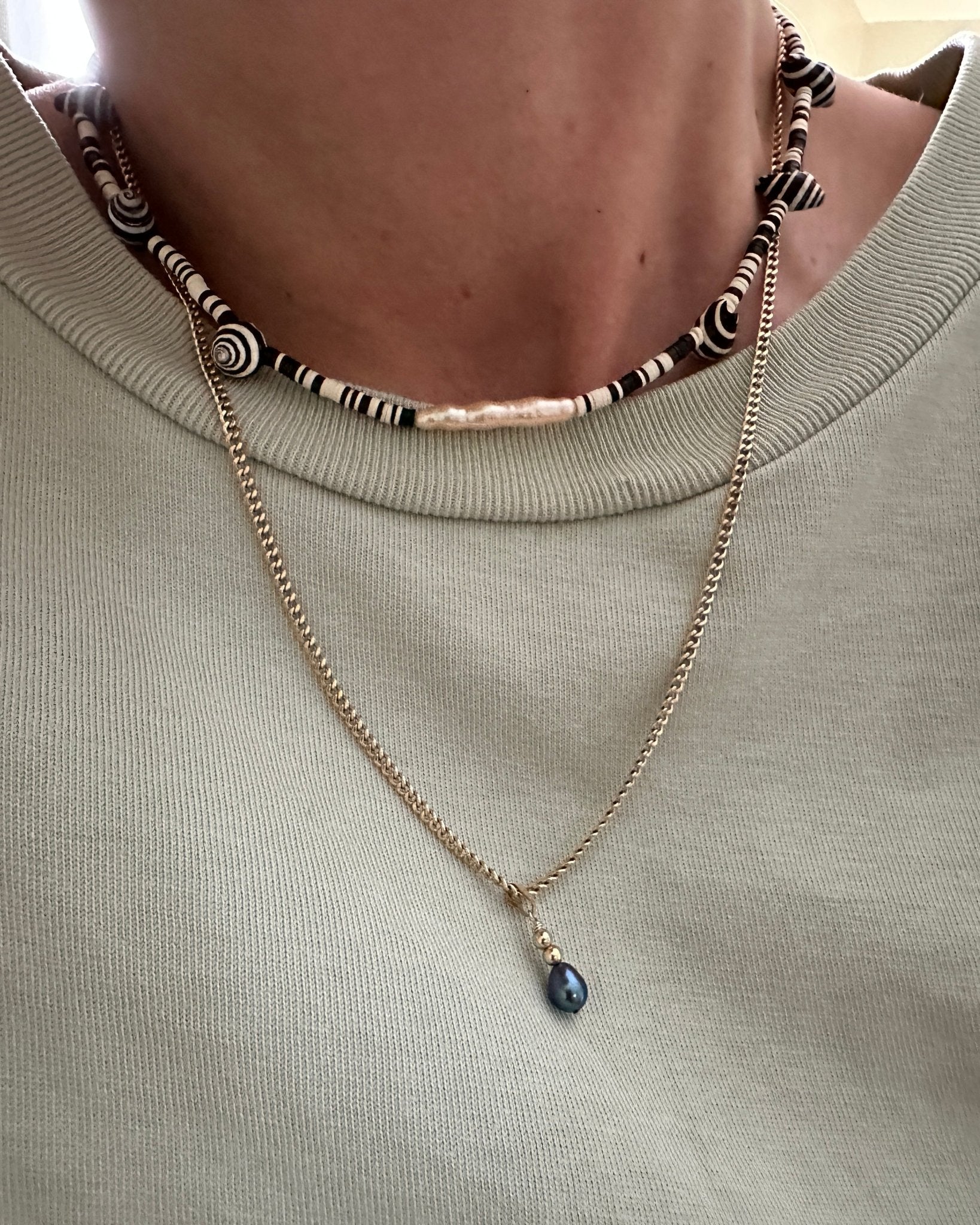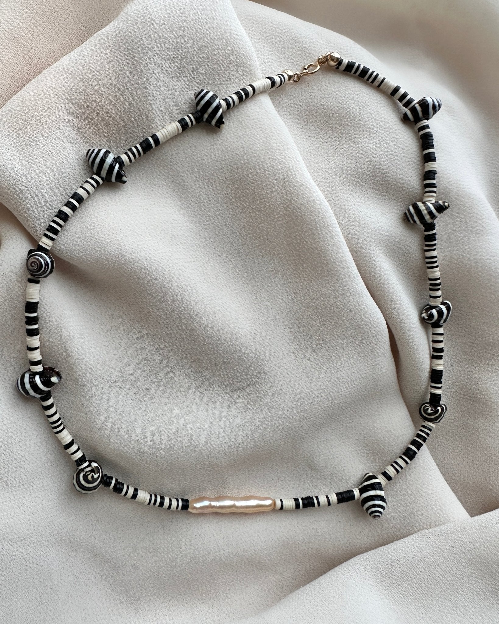 Made of a unique peach Biwa pearl, black and white shell beads and 14kt gold filled closure and details.